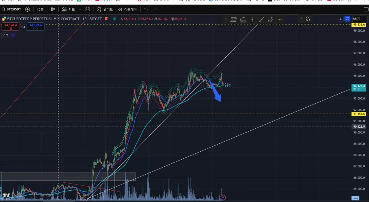 상승 추세선을 벗어나 숏을 보고 숏을 탔지만 익절 범위를 좀 길게봤는데 반등이 생각보다 크게 나와 손절 처리 하였습니다.
