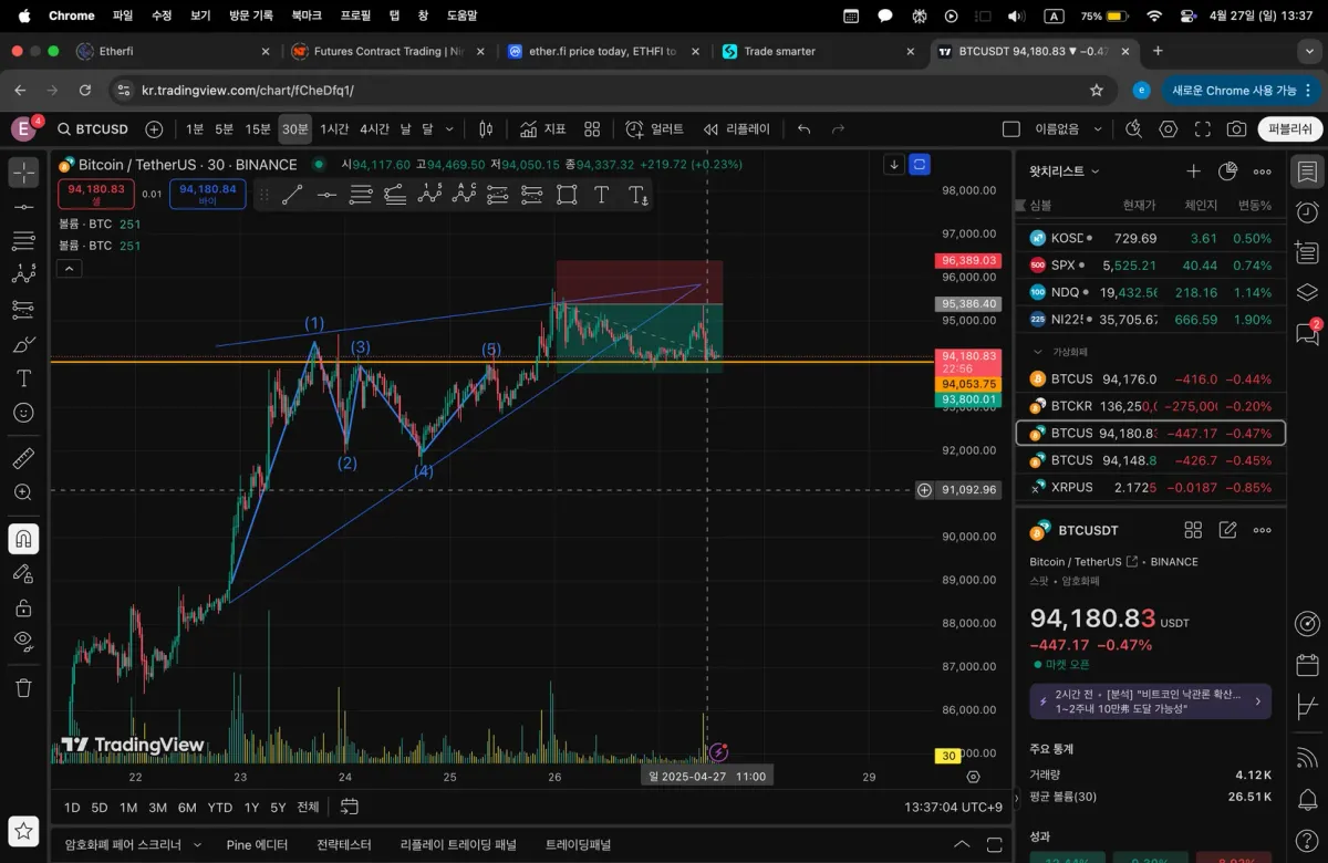 추세선 상으로는 차트가 상승하고 있지만 저점이나 고점 둘다 전점 대비 낮아지는 것을 보여 조정이 올거라 판단하여 숏 포지션에 진입하였습니다.