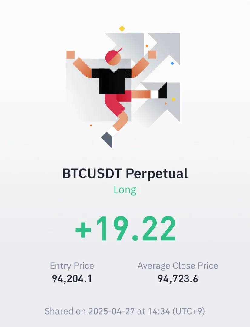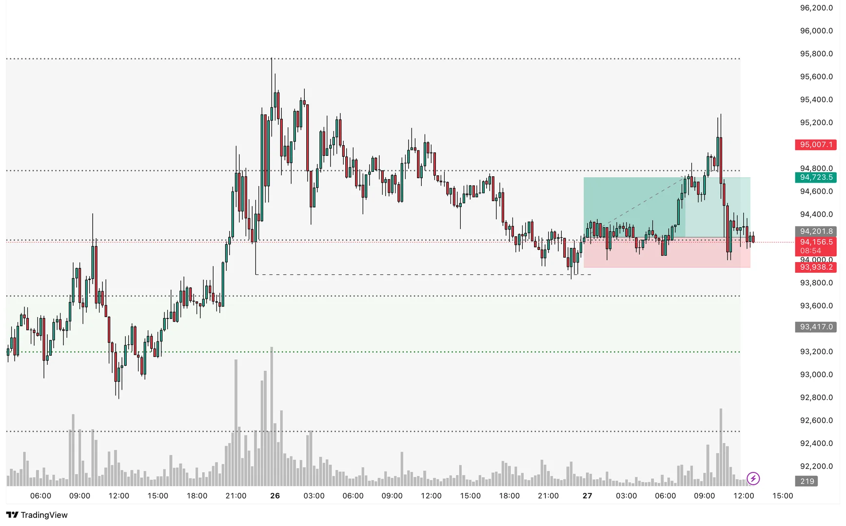 거래량 감소하는 것으로 보아 93.8K 긴꼬리 지지선 반등이라 생각해 롱 포지션 진입했습니다.