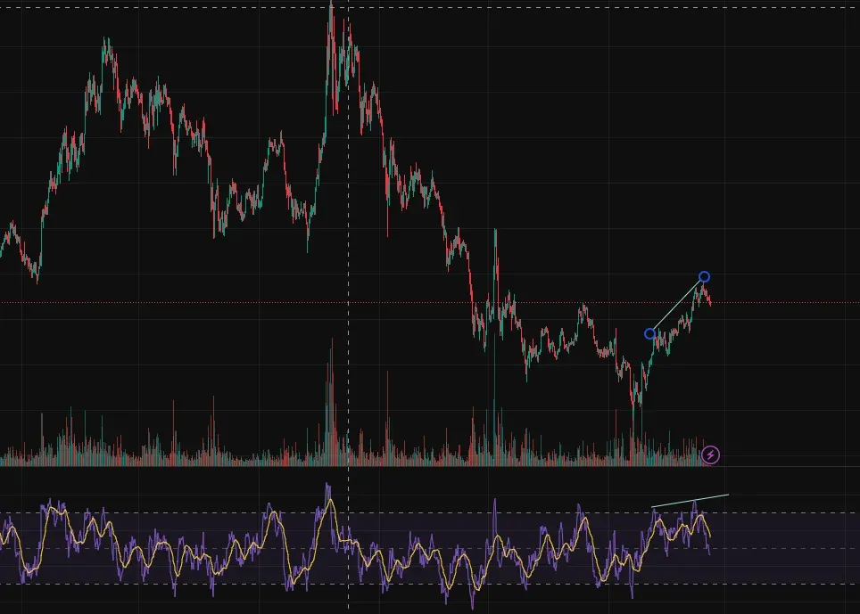 솔라나로 연습해보았는데, 이렇게 선을 긋는게 맞는지는 모르겠지만, 가격은 상승하고, RSI느 또한 상승이어서 다이버전스가 확인은 안됩니다.