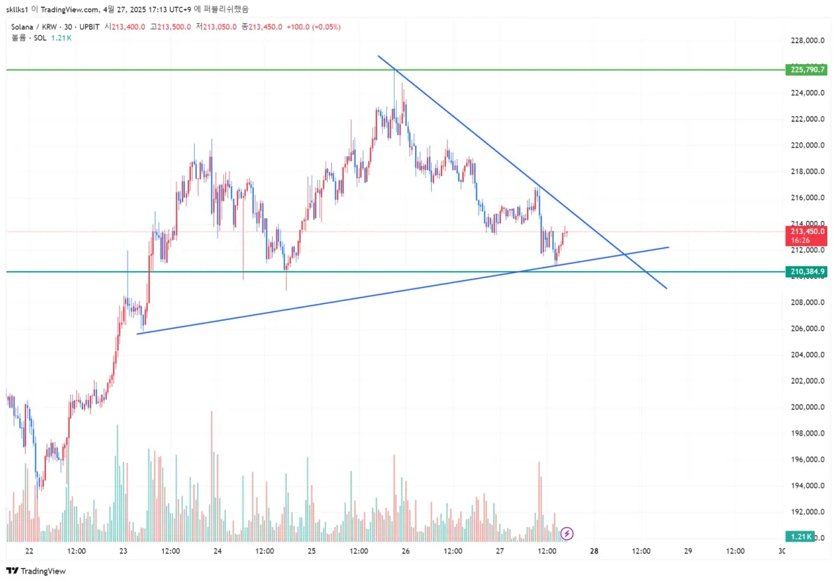 강의의 내용을 참고하여 SOLANA 지지선과 저항선, 추세선을 그려보았습니다.
