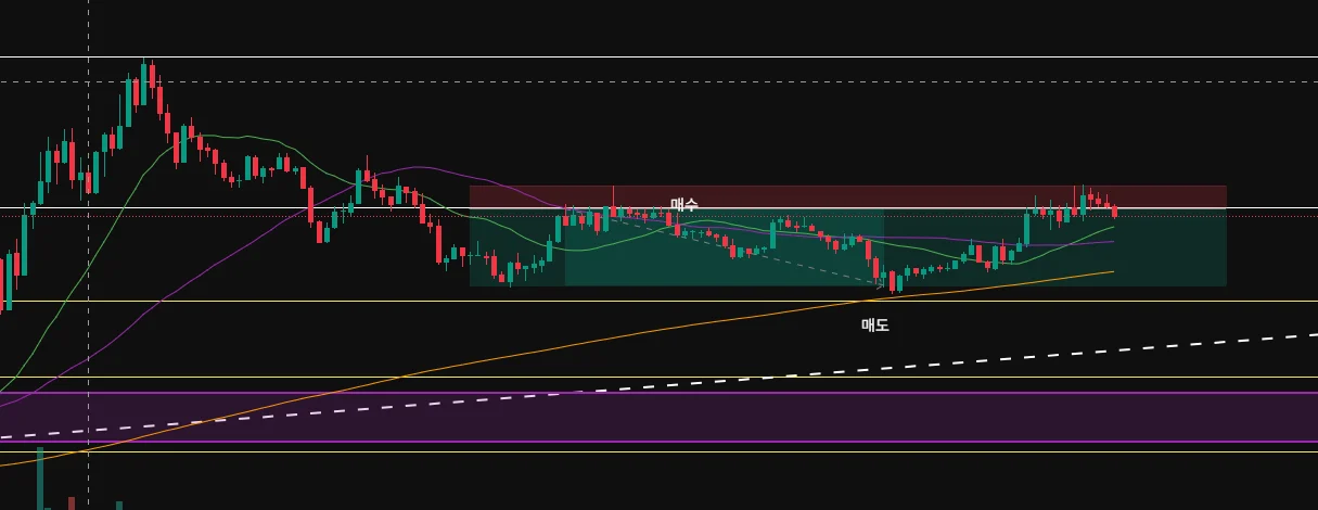 피보나치 되돌림을 사용하여 최고점에서 하향추세로 이어지다가 0.236부근을 리테스트하고 0.382선을 터치하러 가는 움직임이 보이는 것 같아 스탑로스는 이전 봉의 젤 윗꼬리로 설정하고 0.382 선보다 조금 위에 익절가를 설정하여 숏포지션으로 진입했습니다. 현재는 0.382선을 제대로 터치하지 못하고 다시 0.236부근을 터치한 후 횡보세를 보이고 있는 것 같습니다.
