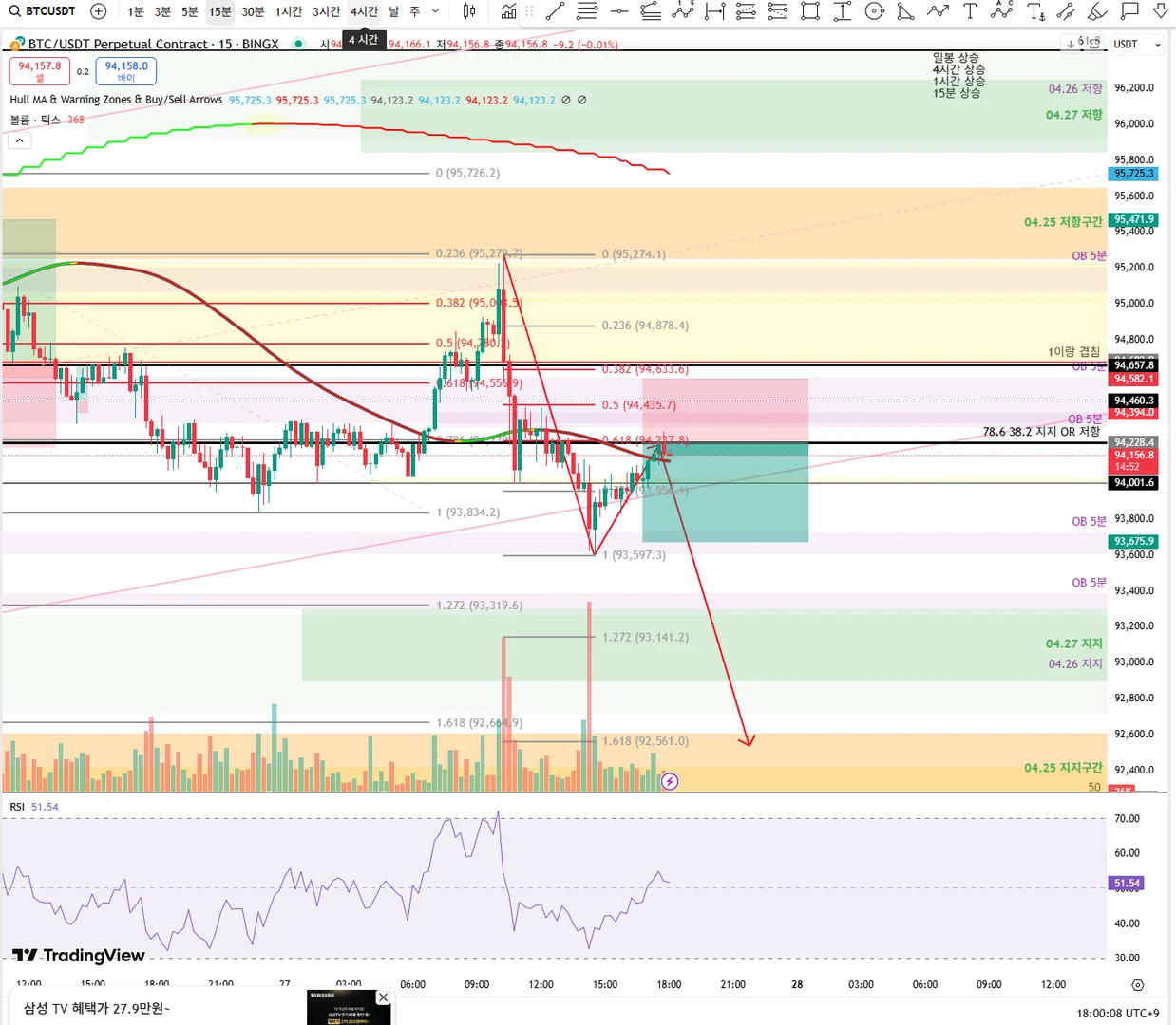 15분봉 피보나치 되돌림 구간 61.8 구간에서 가로줄이 모이는게 확인됨.