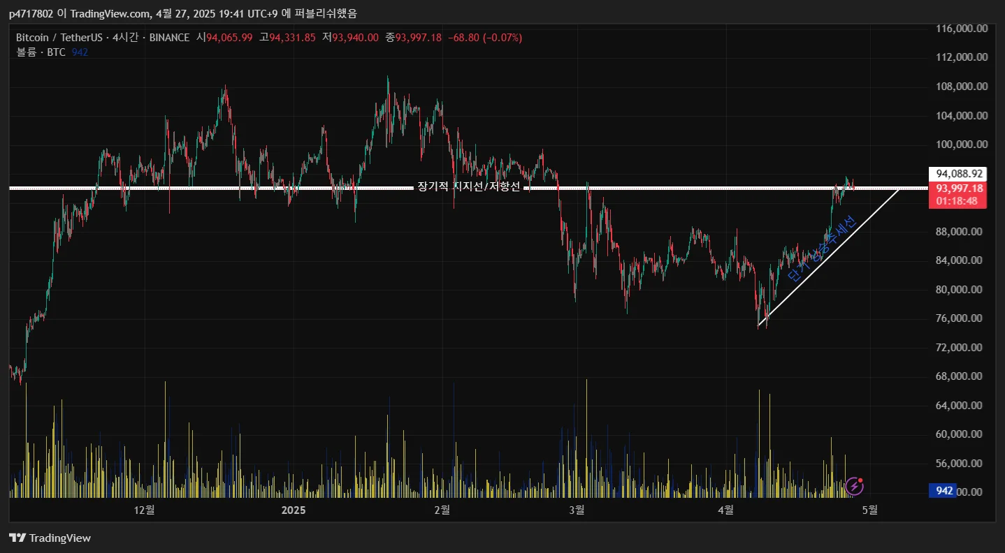 장기적 저항선이자 지지선에 해당하는 94k를 터치하였으므로, 적어도 단기 상승추세선에 닿을때까지는 일시적 조정이 예상됩니다.