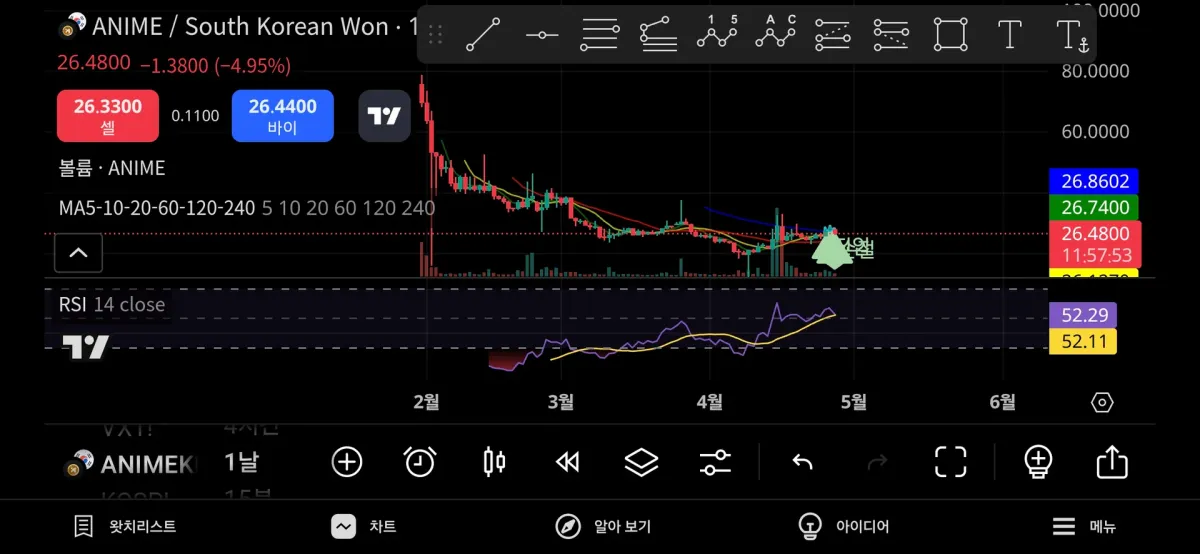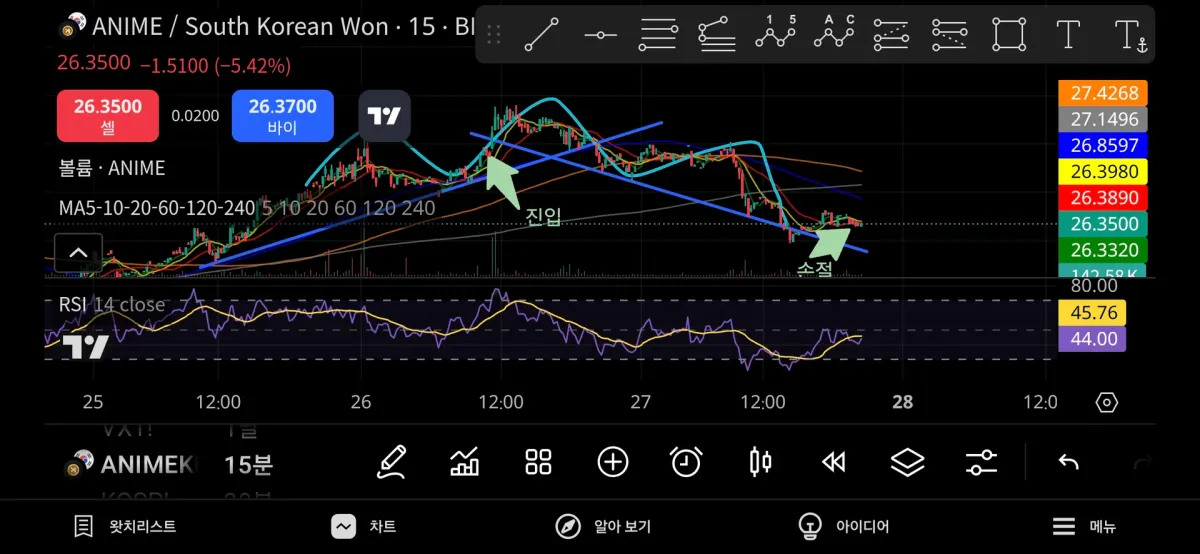 애니메코인 10분봉과 일봉을 보고 매수했습니다.