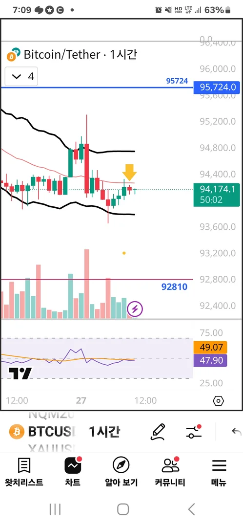 비트코인 1시간봉에서 볼린저밴드 중단선 맞고 내려올때 숏 진입해서 볼린저밴드 하단선에서 익절