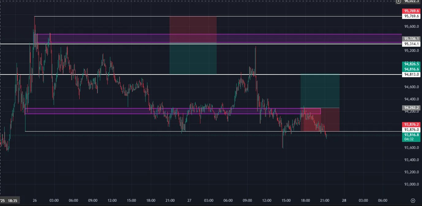 1) 24일 목요일 21:30 경 이전 저점인 92,000 뚫고 다시 반등하는 모습 보이길래 이전 고점 94,900쯤 타겟으로 손절 짧게 가져가는 매매 진행했습니다.