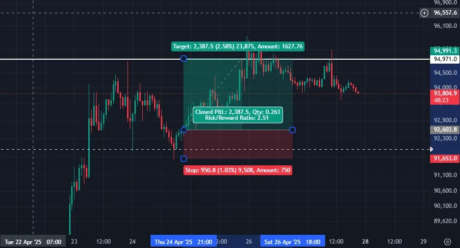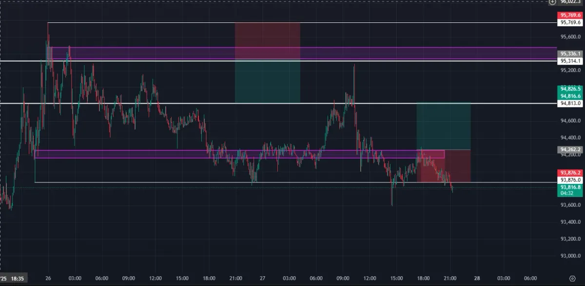 1) 24일 목요일 21:30 경 이전 저점인 92,000 뚫고 다시 반등하는 모습 보이길래 이전 고점 94,900쯤 타겟으로 손절 짧게 가져가는 매매 진행했습니다.