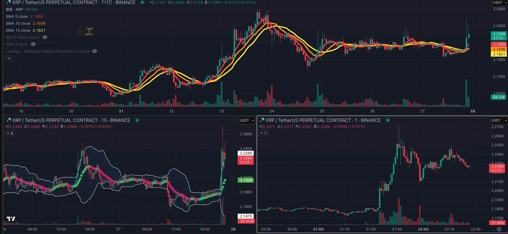 이평선, NWS, 볼린저밴드 활용한 1시간, 15분, 1분봉 셋업입니다.