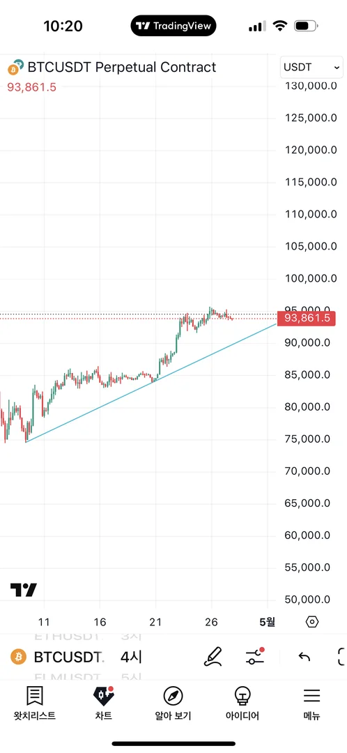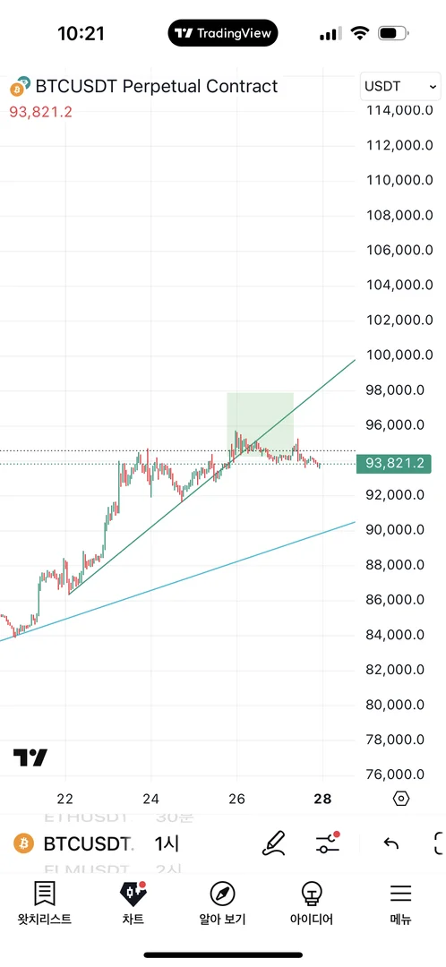 1시간 봉에서는 상승추세선 아래로 내려오며 추세 전환이 되려는 움직임