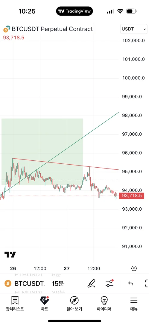 15분 봉에서 하락추세선 하나를 그릴 수 있고 이대로 계속 저항을 받는지 모니터링 할 수 있다!