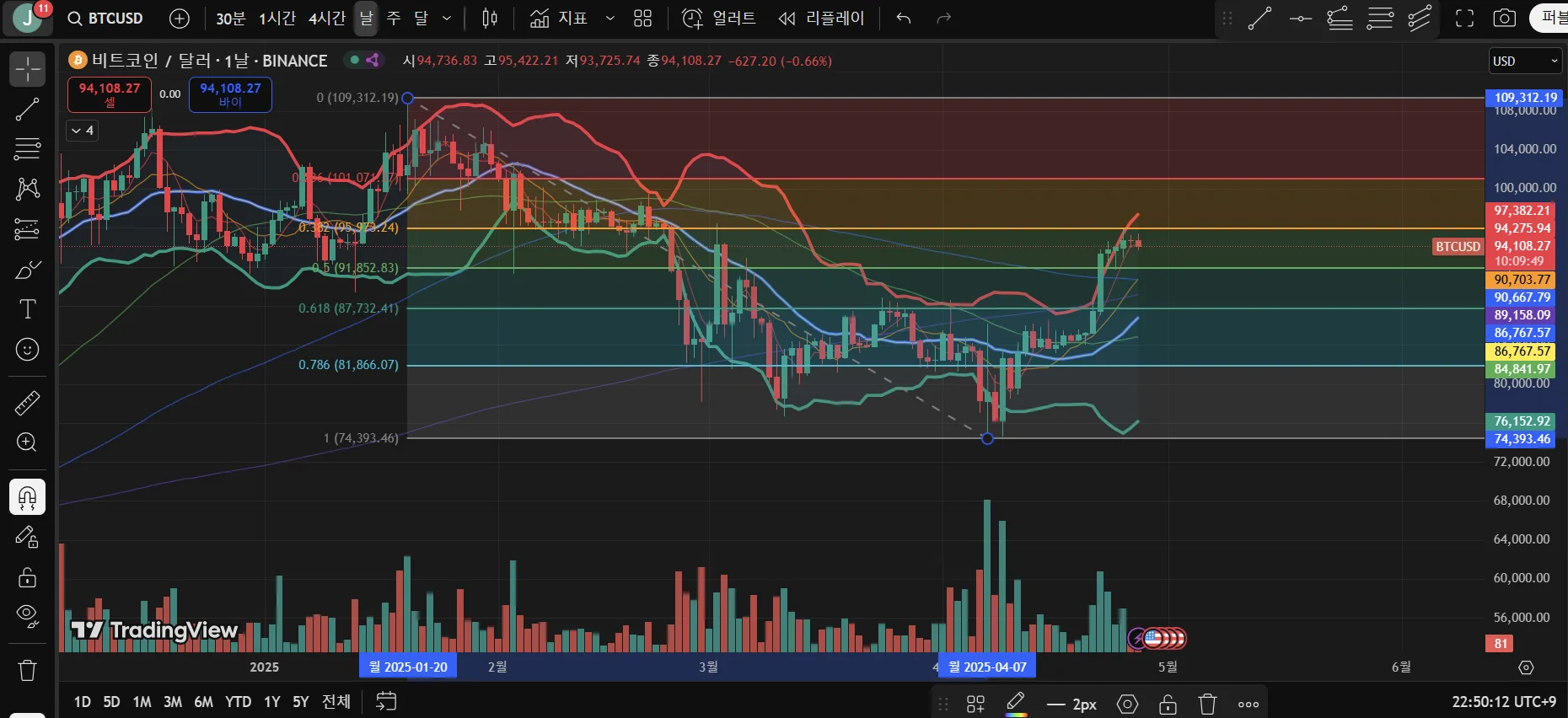 주황색선인 0.382 되돌림 구간에서 25년 2월 부근에 많은 캔들이 지지를 받고 있고, 해당 4월 22일 발생한 장대양봉이 볼린저밴드 상단(두꺼운 빨간선)을 뚫었습니다. 또한 현재 얇은 빨간색인 5일선이 100일선인 파란 얇은 선을 뚫고 올라왔고, 10일선(주황얇은선)과 100일선(파란얇은선)이 만나고 있습니다.