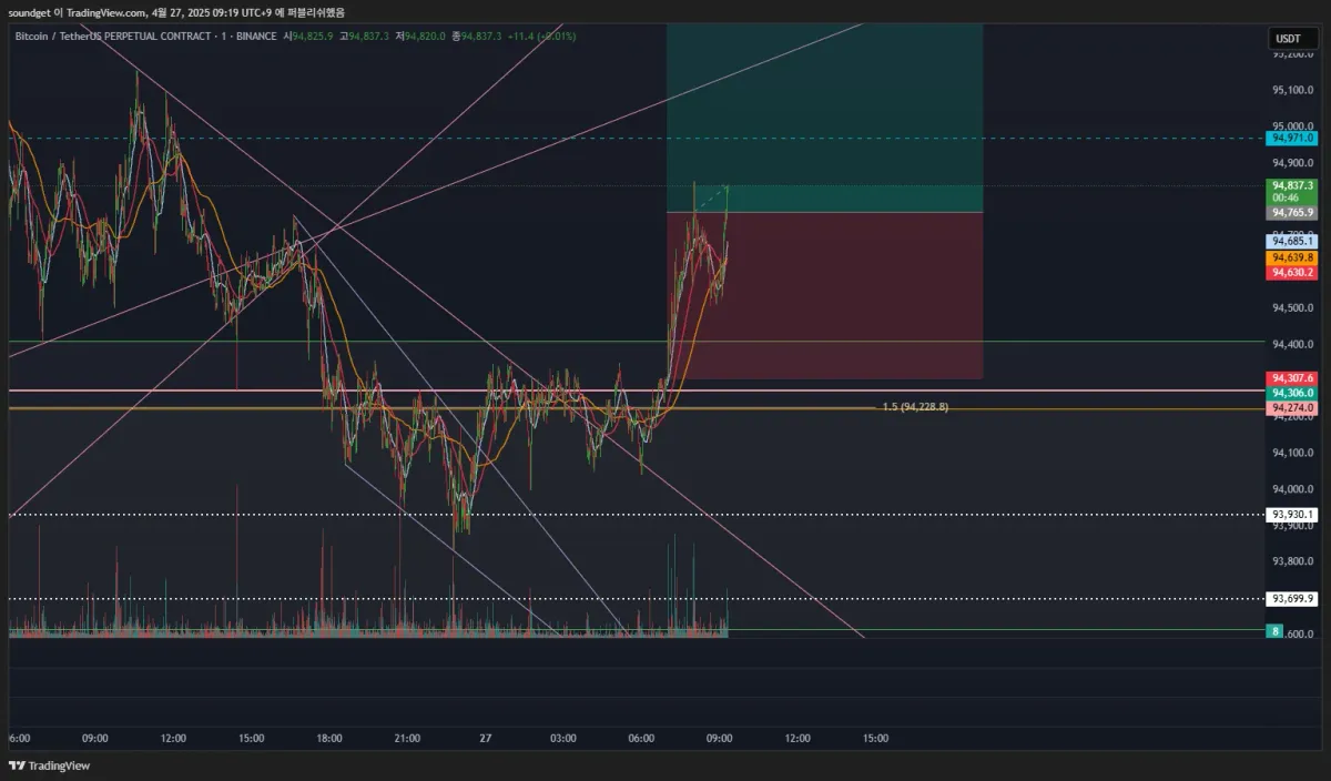 진입:94765.9/스탑:94307.6/익절:95453.8/손익비 1:1.5