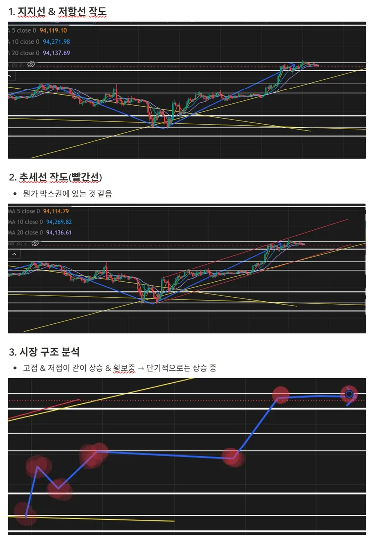 작은 프레임에서는 횡보 구간이라 패턴을 그리기 어려웠습니다. 그리고 추세선은 조금 시간이 지나고 나서야 쓰이지 않을까 하는 생각입니다...
