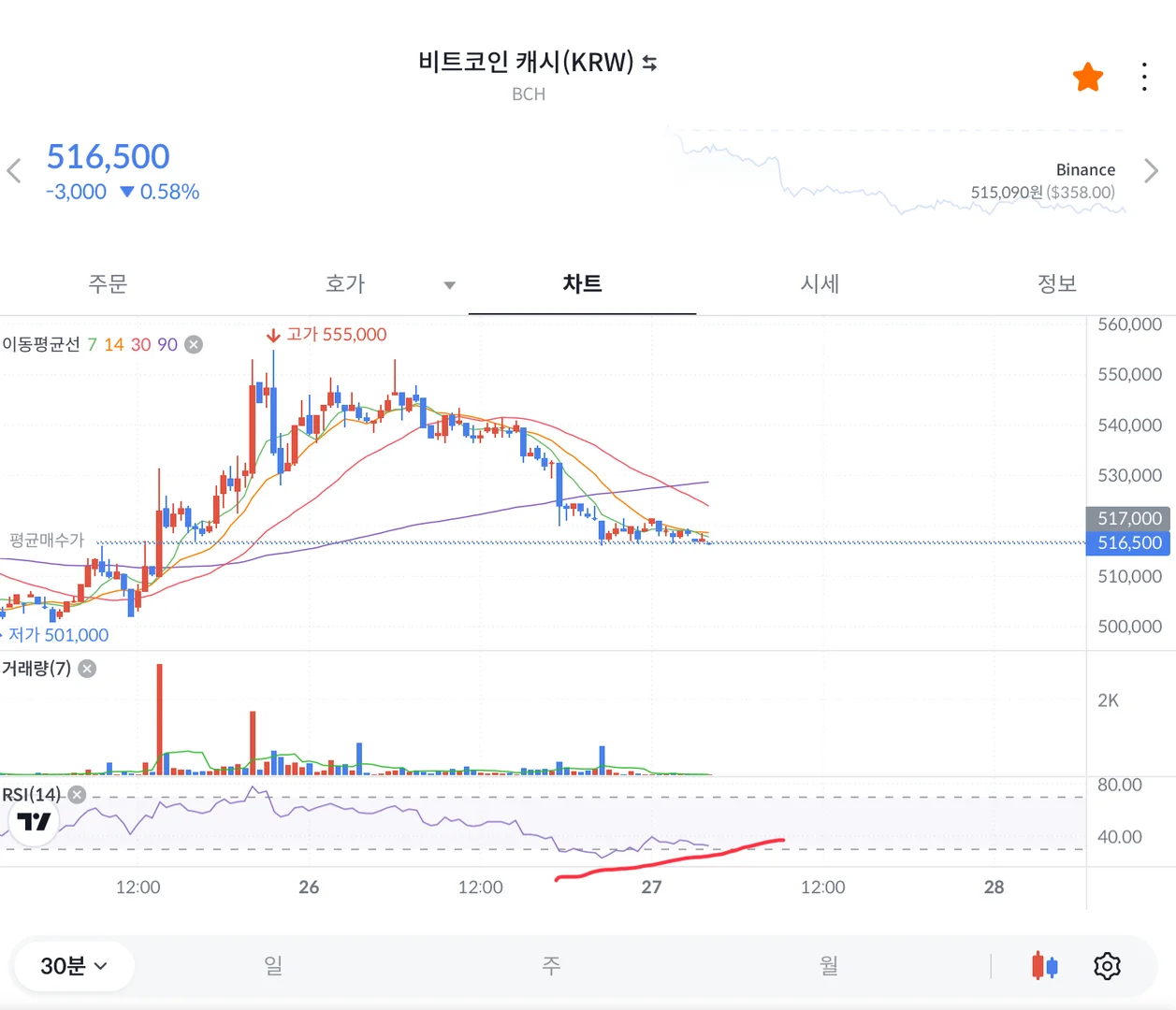 rsi의 상승추세,4시간봉 기준 상승 추세를 고려하여 진입