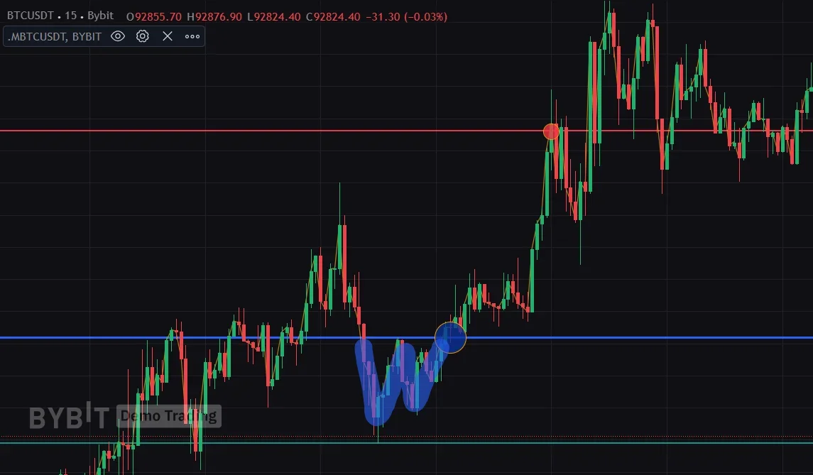 2) 마침 15분 봉에서 더블바텀이 나왔고, 파란색인 넥라인 선을 돌파 후 리테스트할 때 들어갔습니다.