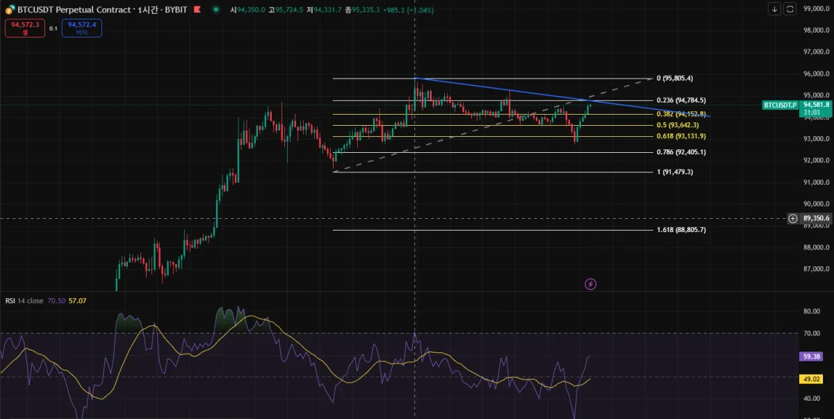 이걸 봤을 때 94,784 부근에서 되돌림이 나올거라고 판단하여 94,200~94,780 사이에서 숏 분할진입하는게 좋은 방법이라고 생각했습니다.