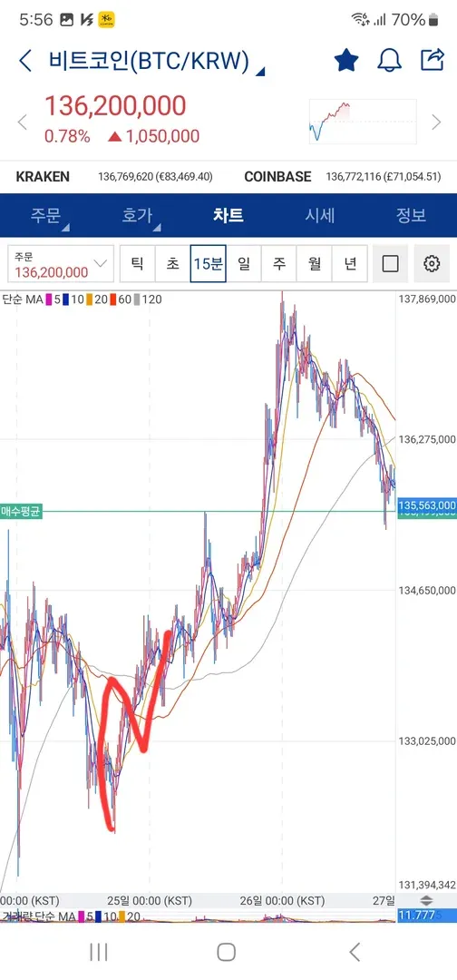 음봉에서 양봉으로 바뀌면서 상승전 패턴 나와서 진입핬고 수익은. 아주조금 봤습니다