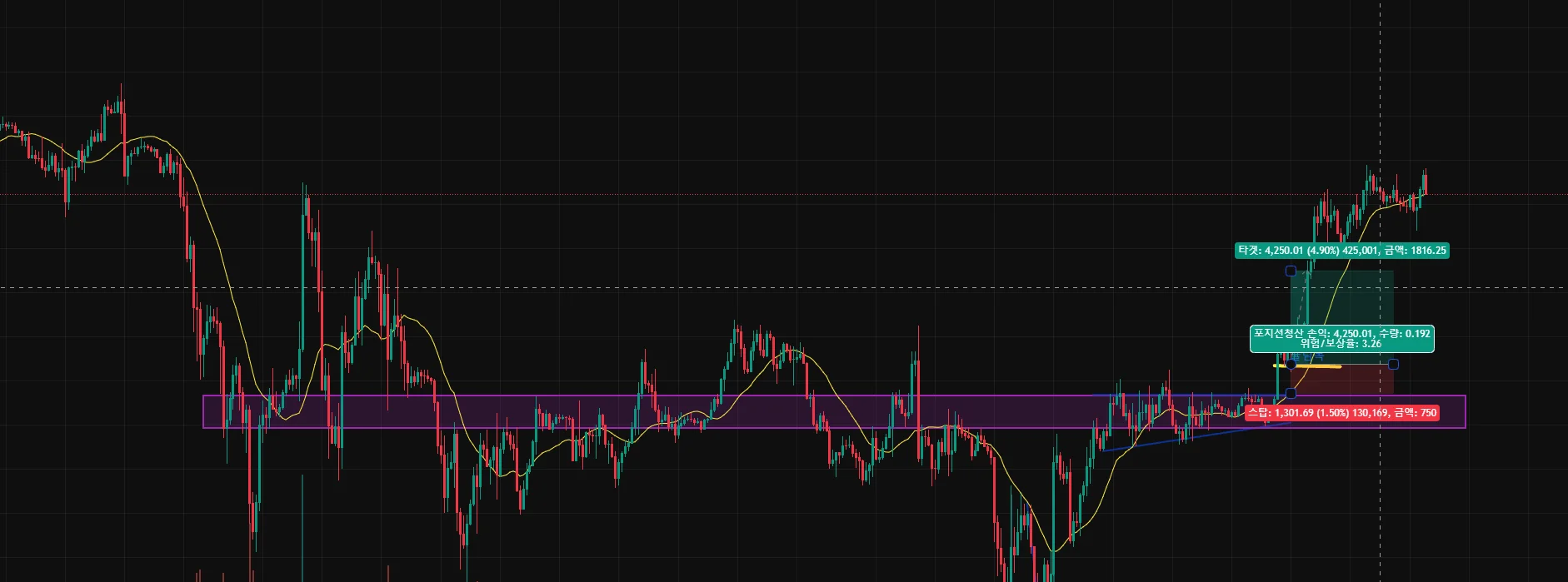 목표가는 다음 주요 저항대인 91k까지 보았고, 손절은 아래 지지선인 85.5k로 잡았습니다.