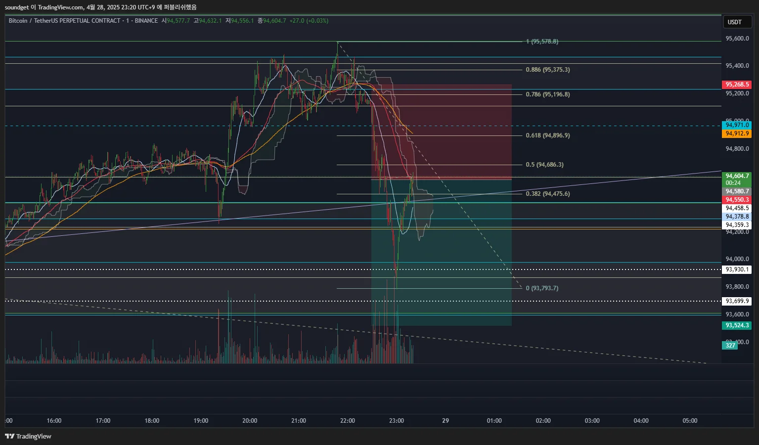 진입:94580.7/스탑:95589.30/익절:93223.80/손익비 1:1.5