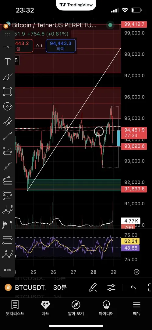 30분봉상, 상승유지 추세를 이탈하고 가격이 내려가는것을 확인하고, 추세선을 다시 닿으러 가는 와중에도 빠진상황이라 상방으로의 저항이 지속적으로 확인되어,