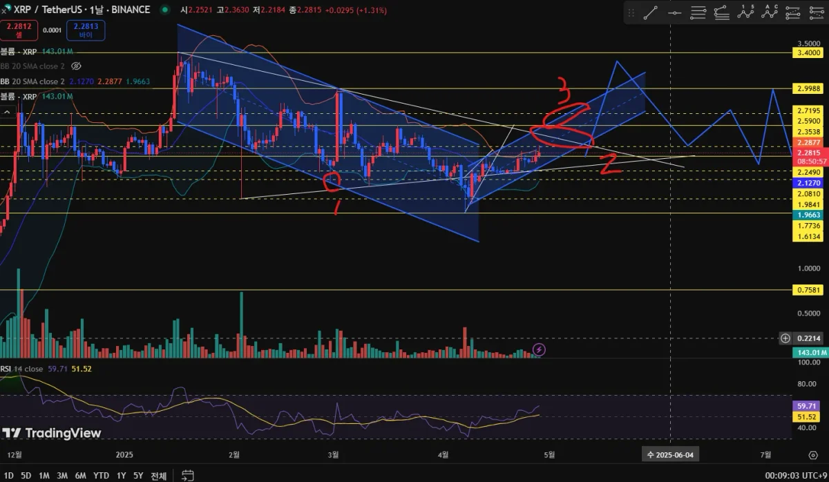 상승 페러렐로 3번을 뚫고 올라가야 상승선으로 올라서 상승장으로 들어갈거 같다고 생각하고 있습니다.