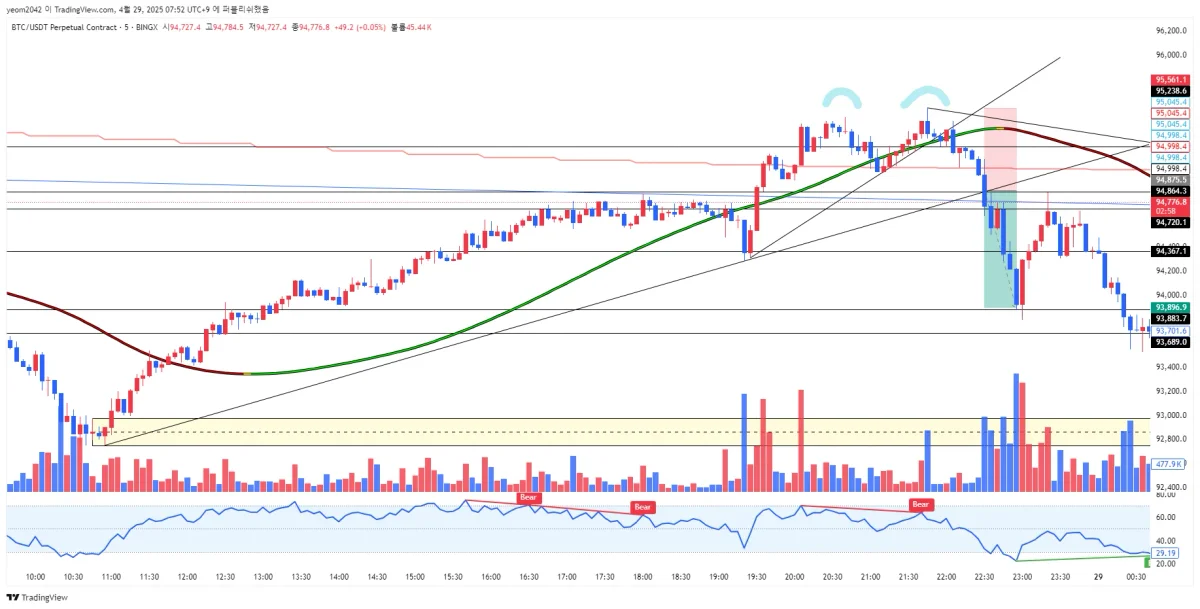 전고 95.5k가 재차 올라와 깨지면 더블탑패턴이 아닌걸로 판단함