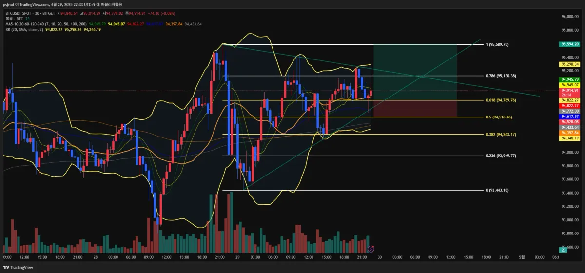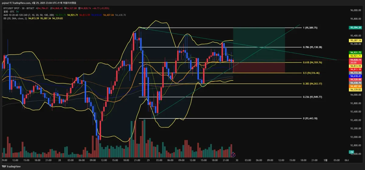 볼린저밴드 상단터치후 반등을 0.618로잡고 94760 롱진입 스탑은 0.5지점