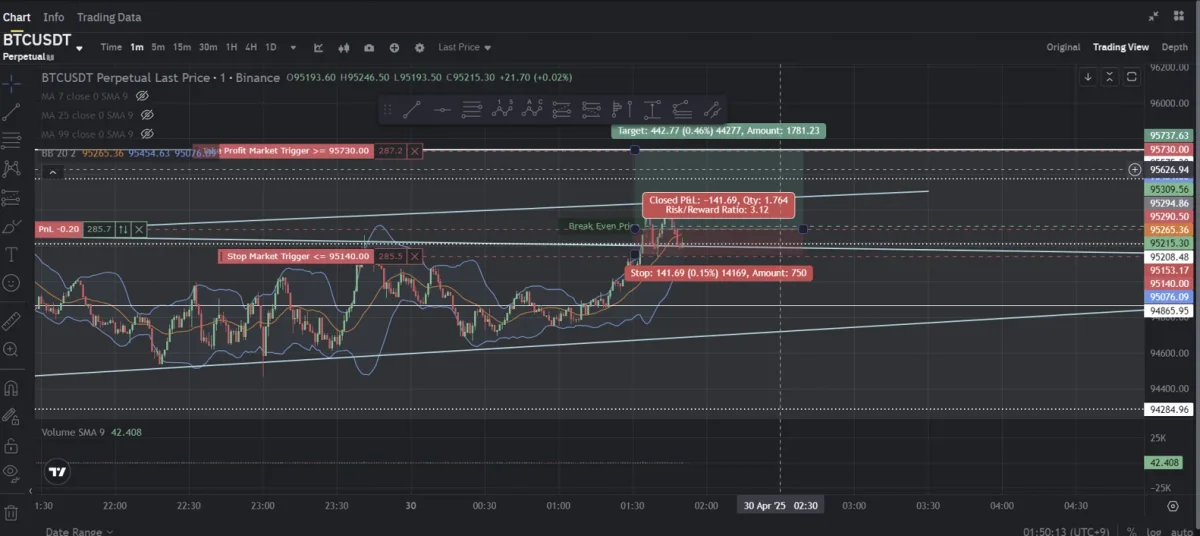 좀 더 긴 시간대에서 봤을 때 삼각 수렴형이었기에 일단은 기다리다가 저항선 돌파 확인 후 리테스트 확인. 이후에 롱으로 진입
