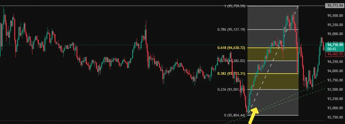-3일 동안 열심히 내려온 95.7k - 92.8k 구간을 되돌리는 과정으로 이해하고 롱 포지션 들어감. 피보나치 되돌림 활용. 적어도 0.786까지는 되돌릴 거라고 생각했고 1 근처까지 갈 수 있을 거라고 생각하긴 했는데 너무 빨리 정리해서 아쉬운 결과 얻음. 0.618 부근에서 계속 횡보하니까 수익실현 못 할까 봐 겁도 나고 가격 변동을 관찰하느라 체력을 너무 많이 소진함. 이전 매매에서 욕심부리다 매도 시기를 놓치기도 해서 욕심을 버리고 수익실현함.