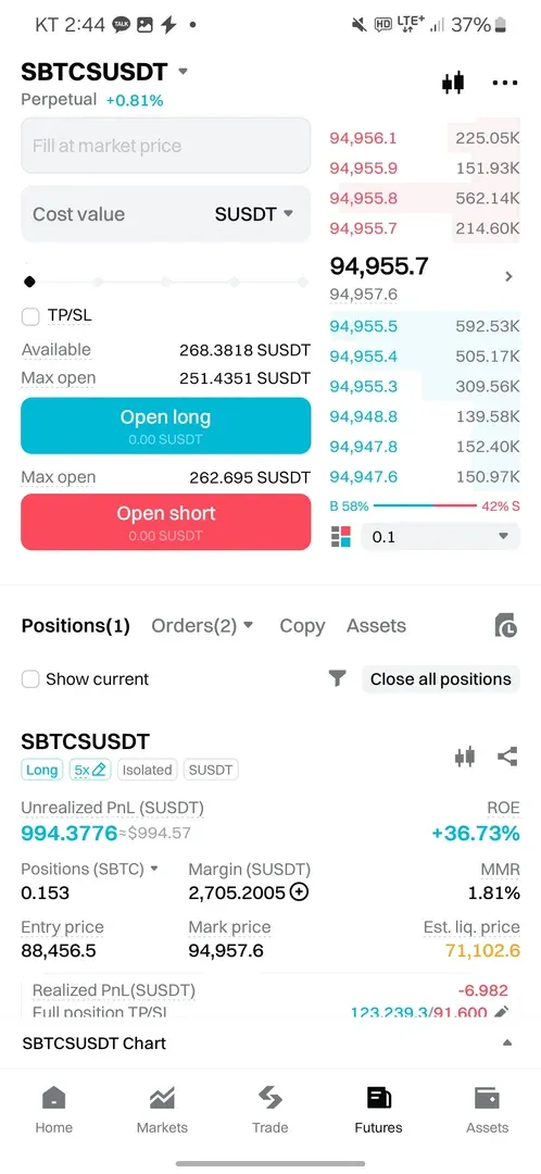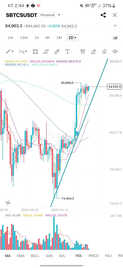 횡보하는 구간의 추세선을 돌파하였을 때, 롱포지션을 들어갔습니다. 그리고 캔들의 꼬리에 추세선을 그었을 때, 해당 추세선에서 지지하는 모습을 보여 현재 상승추세로 판단했습니다. 해당 추세선을 하방 돌파하는 91600달러를 stop loss 로 설정하였습니다. 추세선을 하방돌파하기 전까지 분할로 익절할 예정입니다.