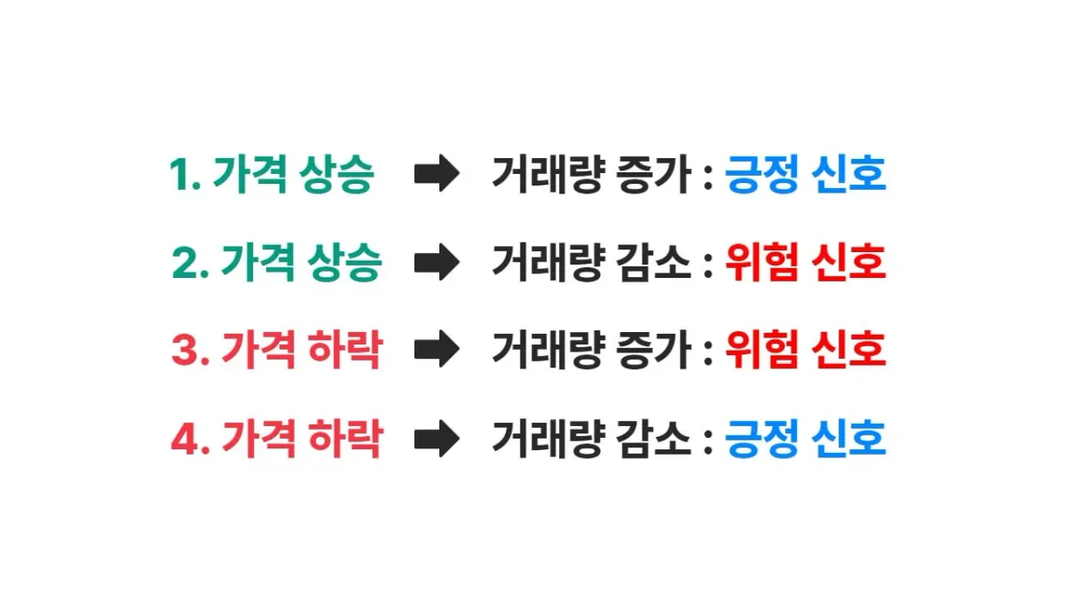 가격이 상승할 때도 하락할 때도 거래량 변화에 따라 각각 2가지 신호가 발생할 수 있다.