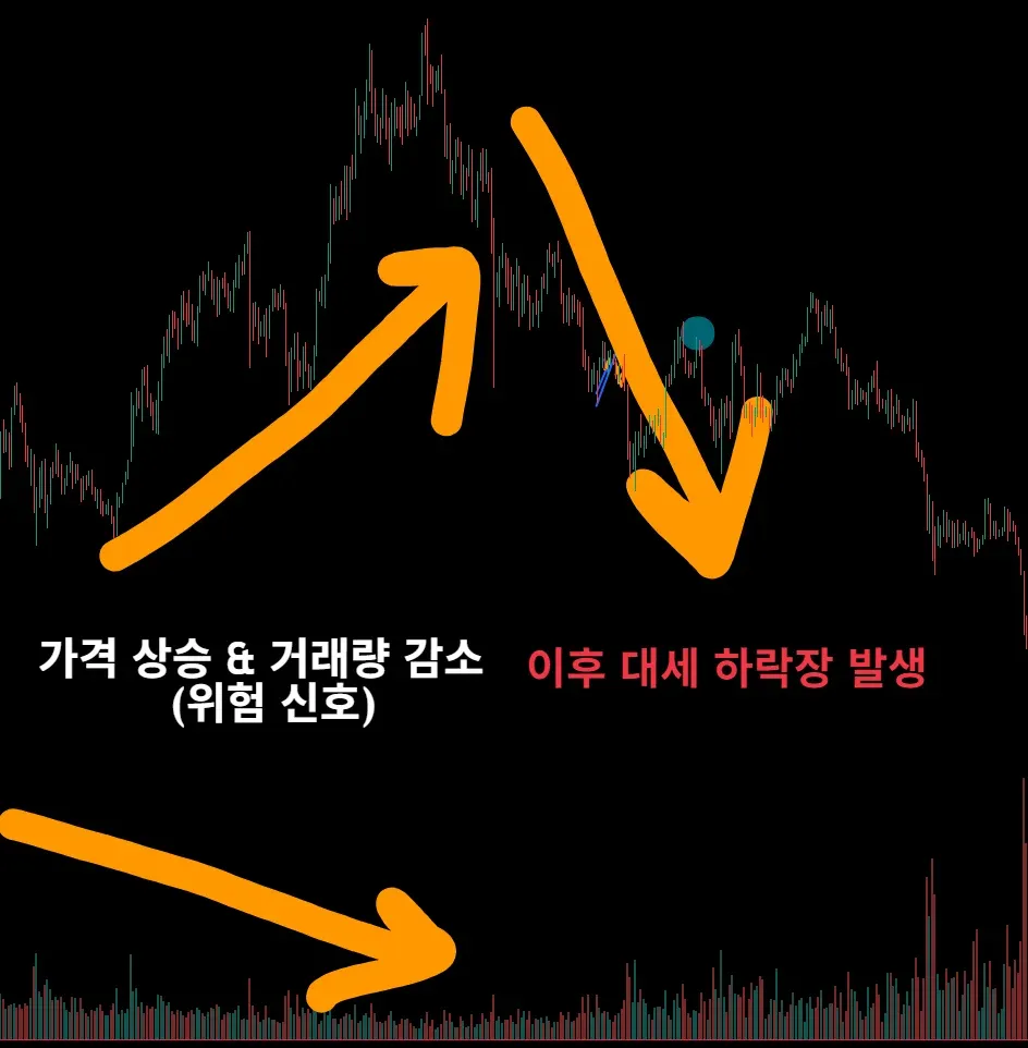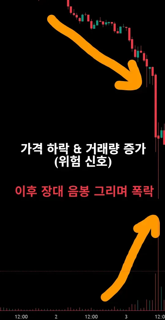 가격이 하락하는데 거래량이 증가한다면 위험신호다. 가격이 더 하락하게 된다. (매도세 급격히 증가)