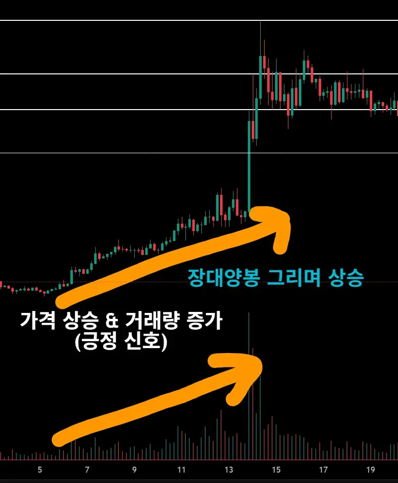 가격이 상승하는데 거래량이 계속 증가한다면 더 큰 상승으로 이어질 수도 있다.
