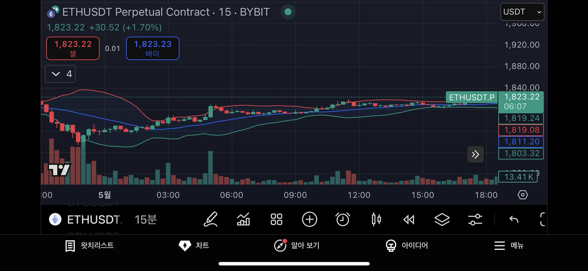 어제 하락이후 15분봉기준 볼벤 20일선을 이탈이 크게나오지 않아 상승으로 스탑로스 수익구간에 잡고 최근 고점까지 바라보고있습니다