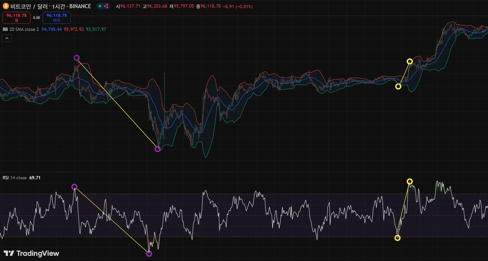 rsi 과매도 과매수 적용 상승 , 하락 다이버전스...