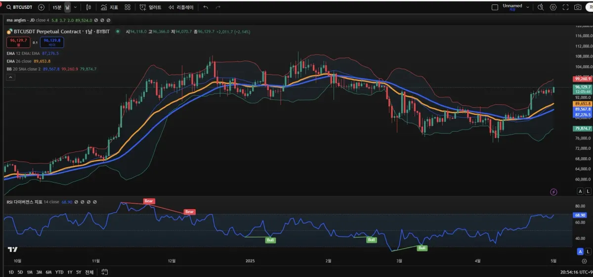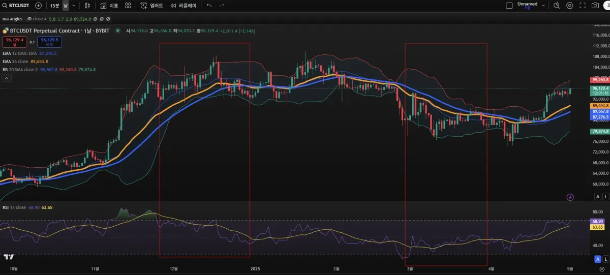- 붉은색 큰 사각형이 있는 구간이 RSI 다이버전스 발생 구간(2024.12에는 가격 상승하는데 하강, 2025.3에는 가격 하락하는데 상승)