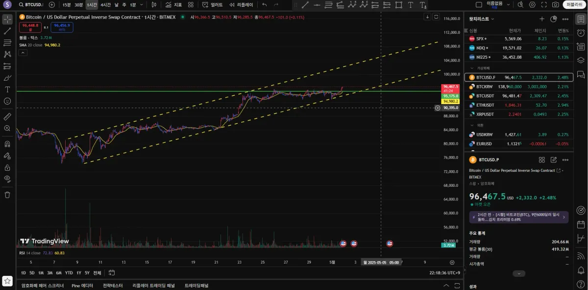 위쪽 노란색 추세선에서 익절 아래쪽 노란색 추세선 이탈시 손절 자리로 잡았습니다.
