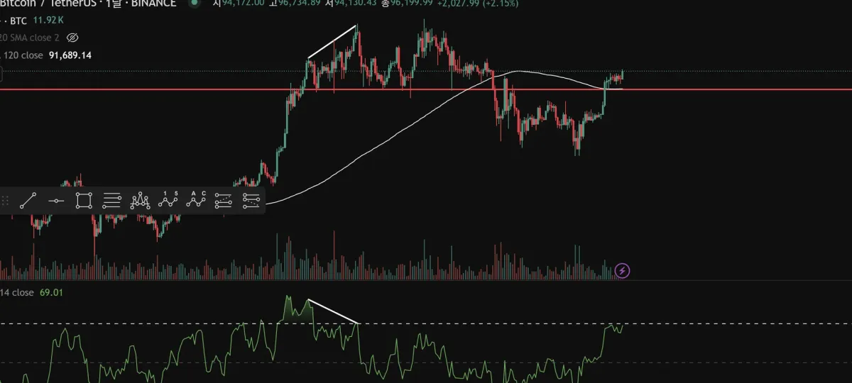 비트코인 일봉 상 하락 다이버전스가 나온 구간입니다