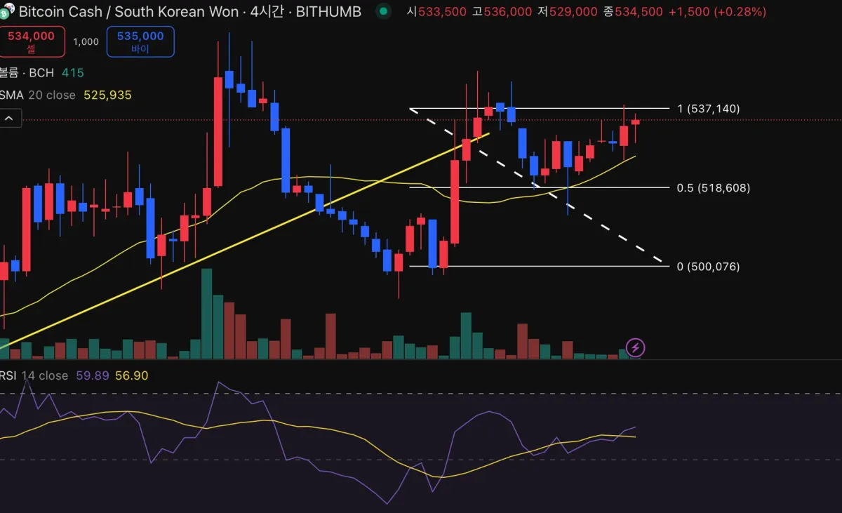-연속 양봉 캔들의 피보나치 0.5에 해당하는 518k에 매수