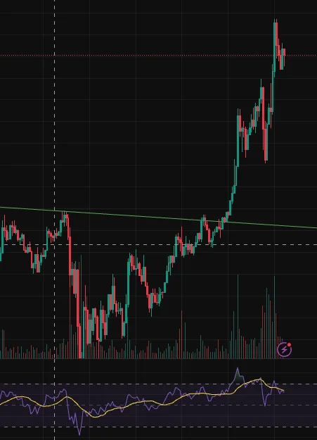 15분봉 차트이고 끝부분의 가격은 올라가는데 RSI는 내려가 하락 다이버전스가 발생해 가격이 소폭 하락한 것을 확인 할 수 있습니다.