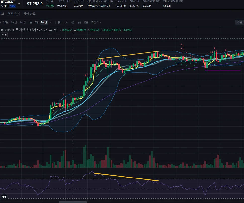 2시간봉 기준 차트상승 - RSI 하락.