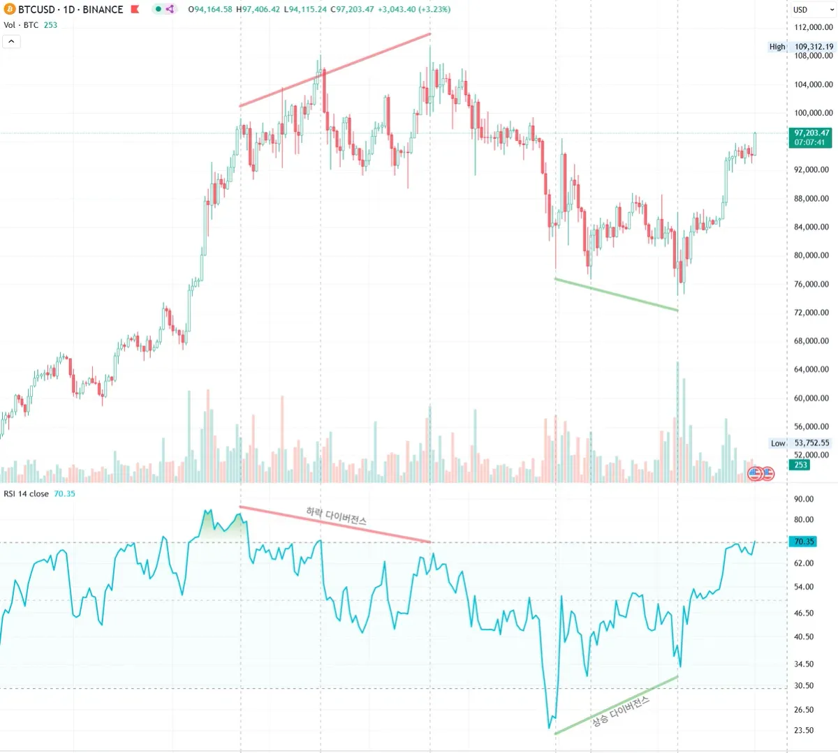 다이버전스는 가격과 지표의 방향이 반대로 가는 현상을 의미하며, RSI와 함께 사용하기 좋은 개념입니다.