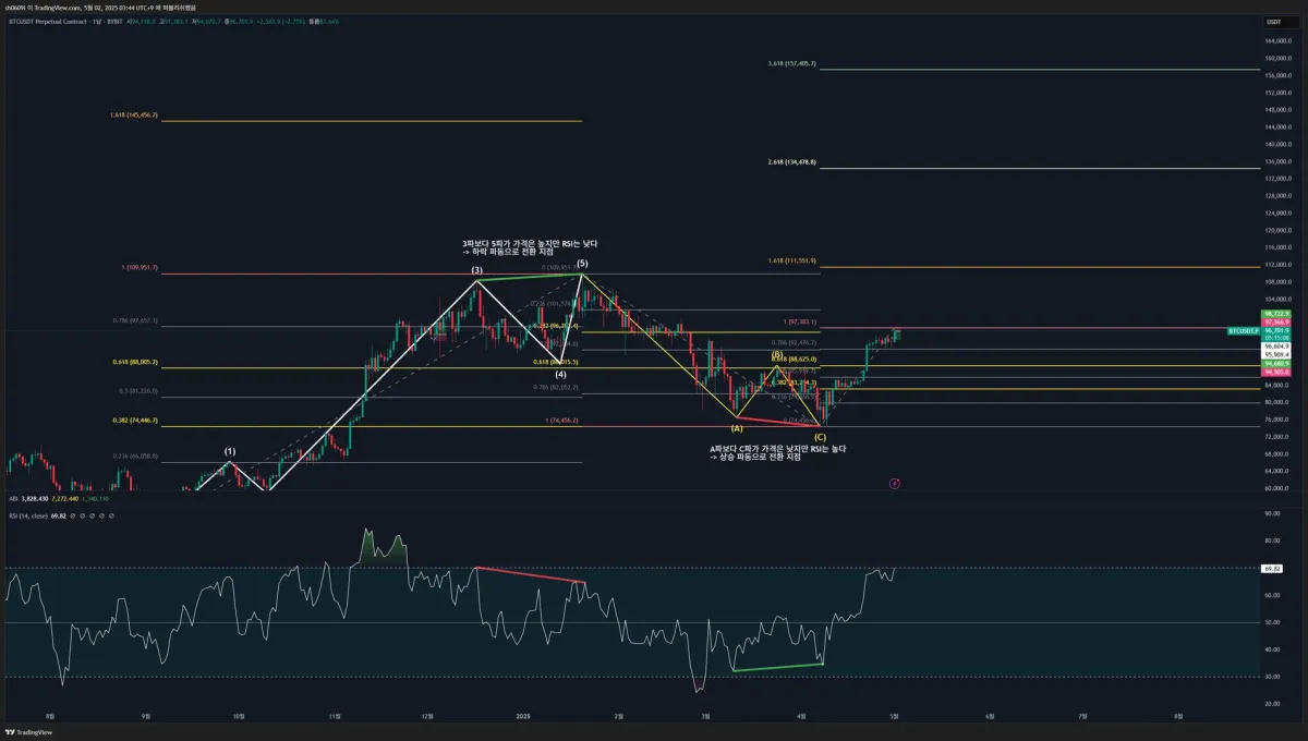 강사님 설명해주신 내용처럼 이전에 제가 분석한 엘리어트 파동과 RSI 다이버전스를 함께 확인해보았습니다.