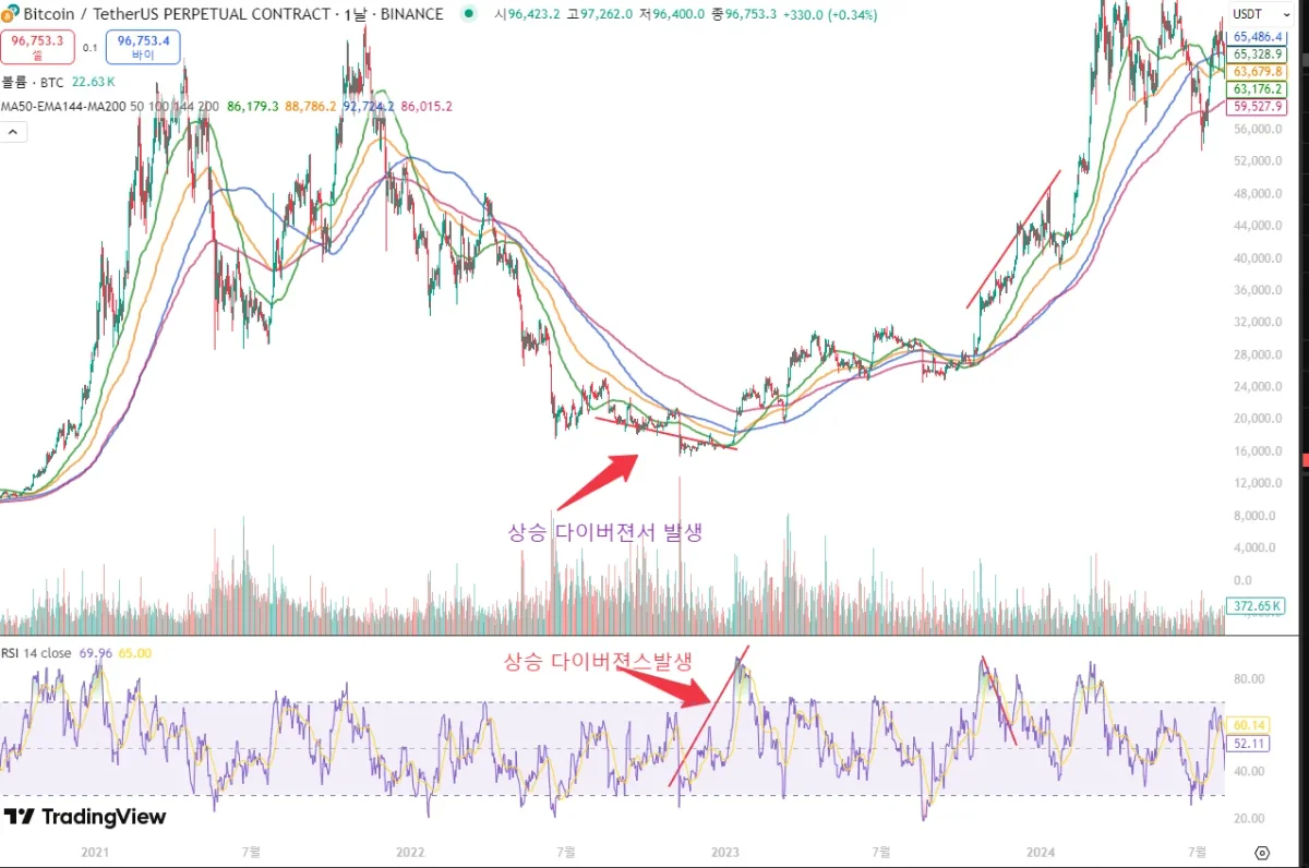 상대강도지수(rsi) 와 이동평균과의 관계에서 다이버젼스를 활용하여 다이버젼스가 발생하면 상승과 하락의 추세를 예측 할 수 있다