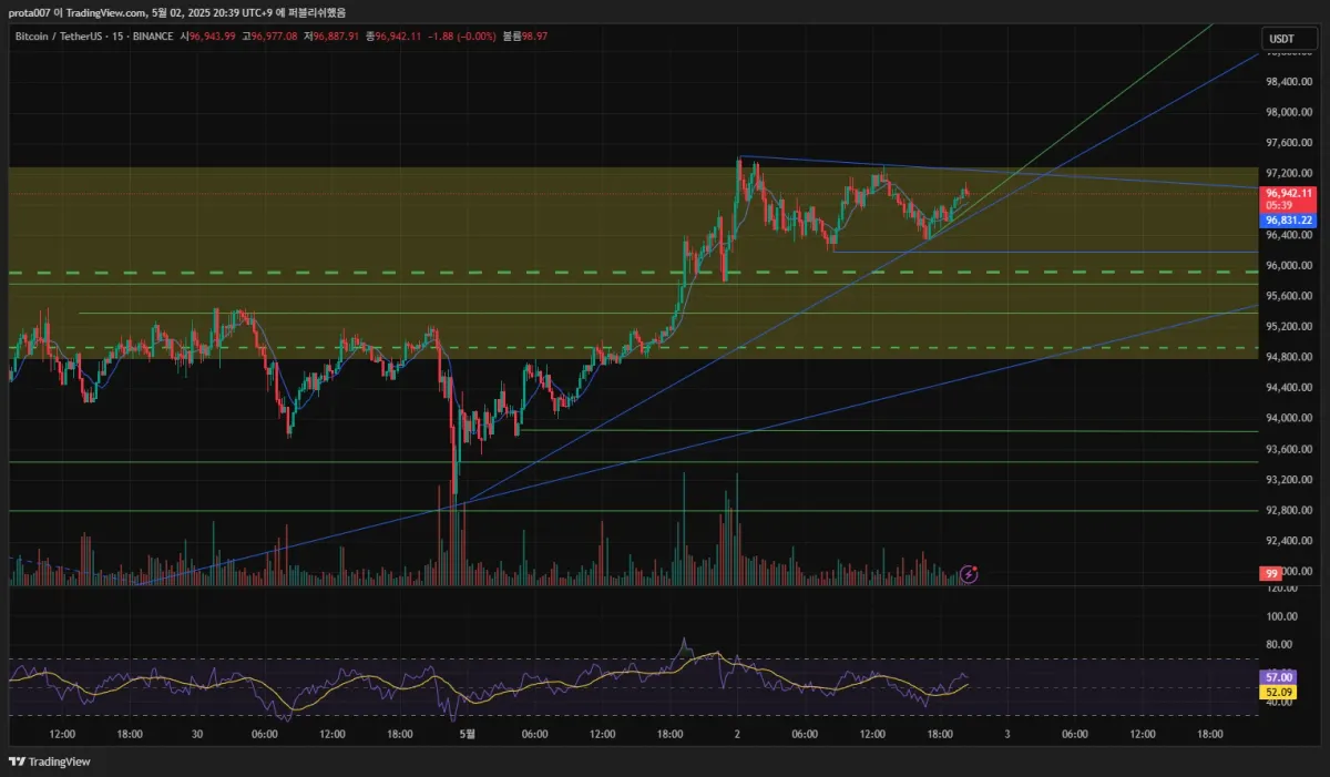 97.2K 돌파시 주요 저항선 돌파 / 저점 지지선 돌파 하락시 단기 하락 ------>>> 현재 ETF 유입량 증가 및 미국 주단위 비트코인 준비금 의회 통화가 지속되고 있고 5/4일 미국 국부펀트 경과 보고서 일정으로 상승 전망을 하고 있습니다. 단 5/2일 미국 실업률 및 5/8일 FOMC 회의 결과를 유의 경계 해야 함