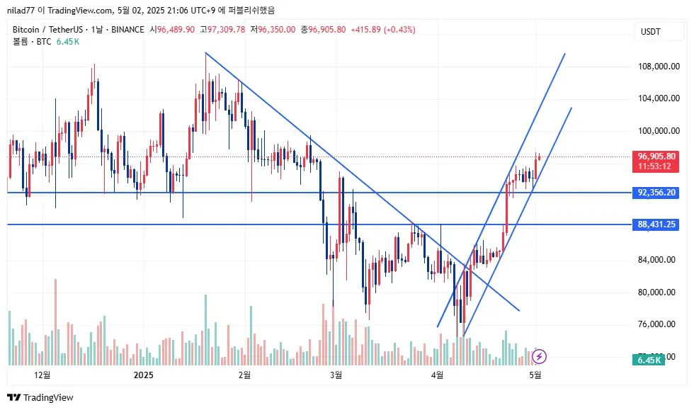 비트코인 일봉차트 상 단기적 관점에서의 지지 추세 저항선 트레이딩뷰에서 작도
