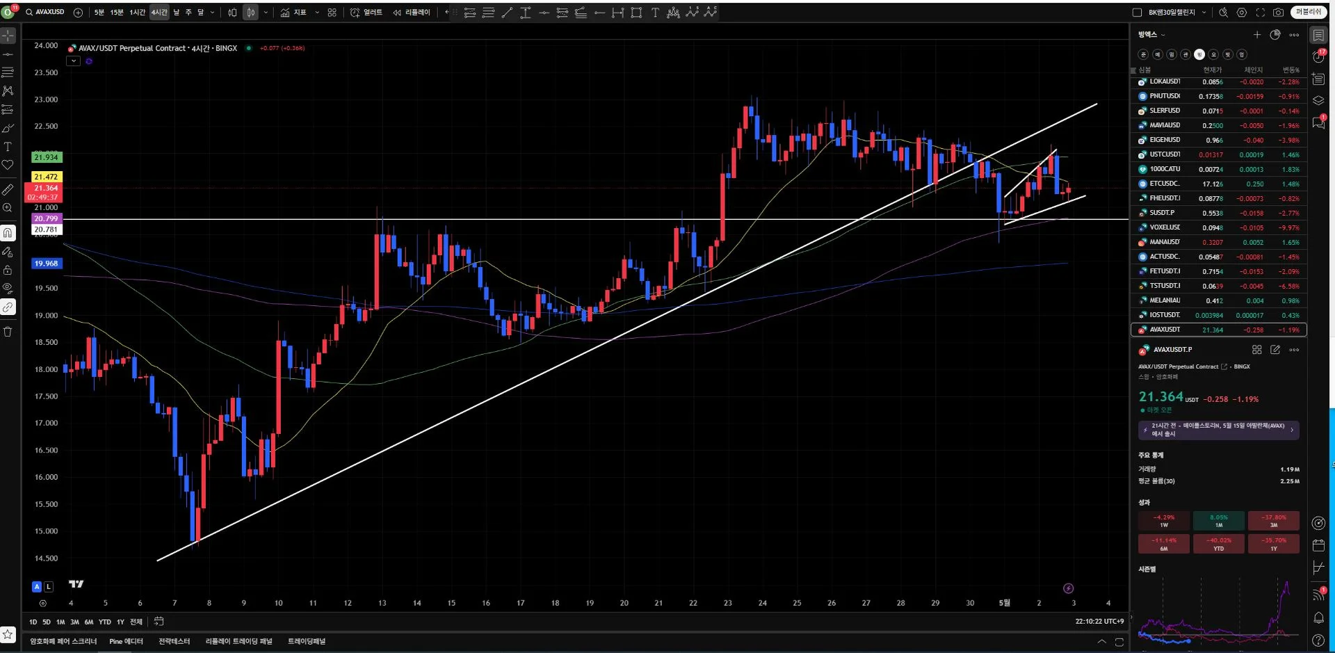 트레이딩뷰 정식판 구매 후 알트코인(AVAX USDT) 4시간봉 지지선과 추세선을 작도하였습니다