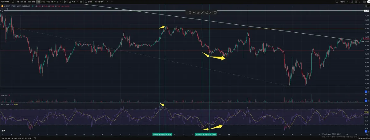 비트코인 1시간 봉 기준으로 다이버전스를 확인하고 체크했습니다. 추세반전의 근거가 될 수 있되, 무조건적인 맹신은 매매의 실패로 이어질 수 있음을 명확히 기억하고 있도록 하겠습니다.
