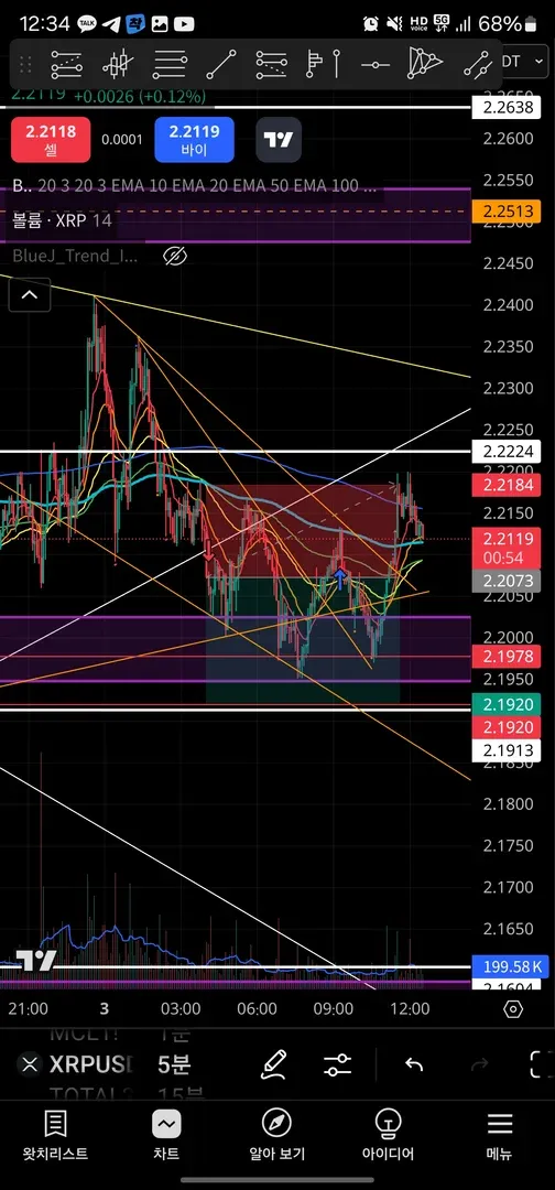2) 넥라인 부근에서 전투가 벌어졌고 상위 타임프레임에서 그려진 상승추세선 이탈